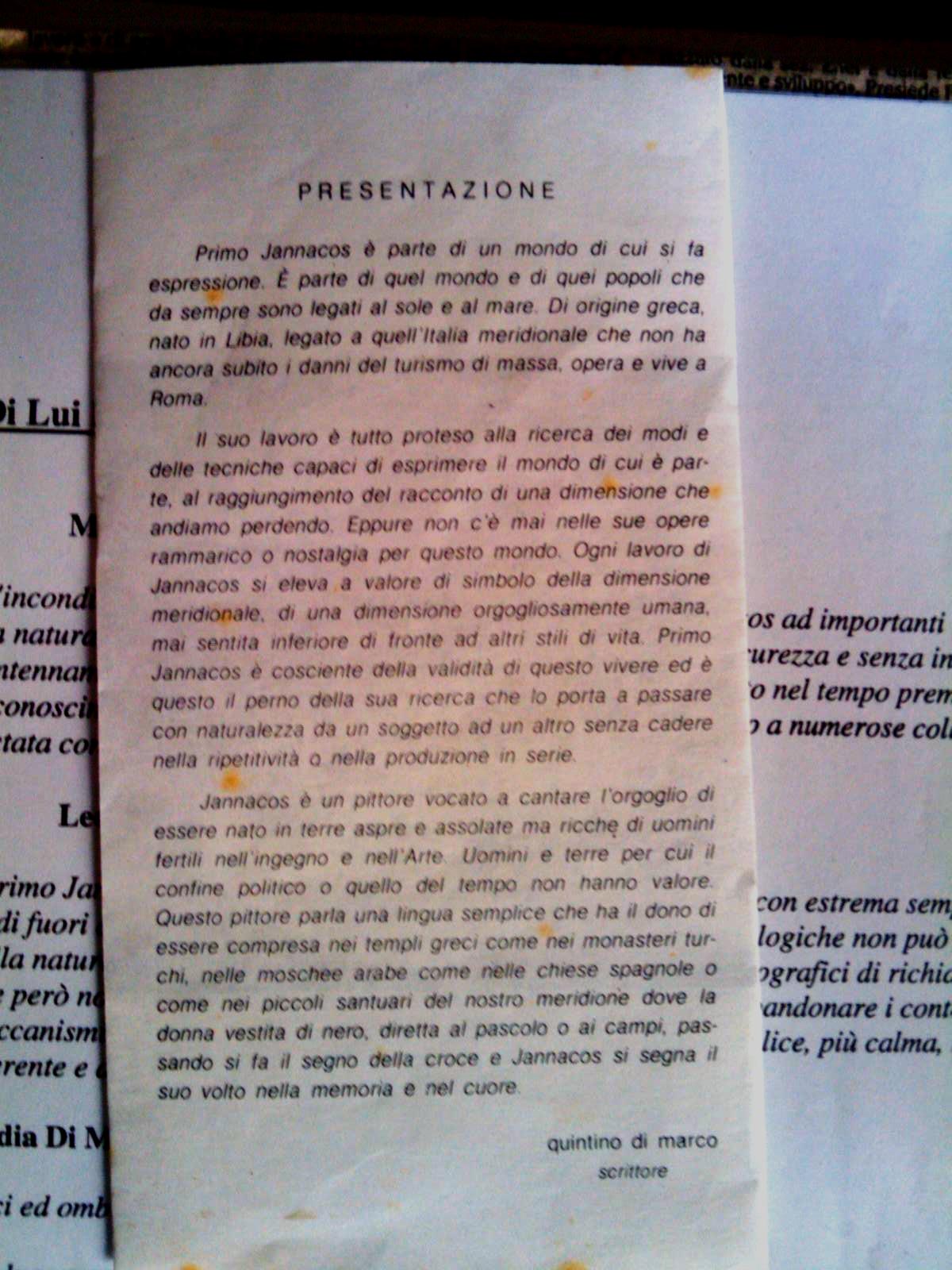 - Leonardo Zonno(Giornalista):"Primo Jannacos ripropone la bellezza della natura, sottolinea con estrema semplicità che l'uomo al di fuori delle sue continue sperimentazioni biologiche e tecnologiche non può rifiutare la realtà della natura. La sua è una pittura semplice, senza elementi coreografici di richiamo. Una pittura che però non passa inosservata e che forse vorrebbe dirci di abbandonare i contorti e precari meccanismi dell'attuale società per tornare ad una vita più semplice, più calma, ma certamente più coerente e accettabile."